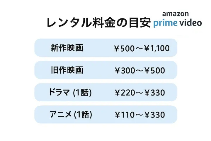 Amazonプライムビデオのレンタルは、110円〜1,100円程度で最新映画や見放題対象外の作品を楽しめるサービス です。