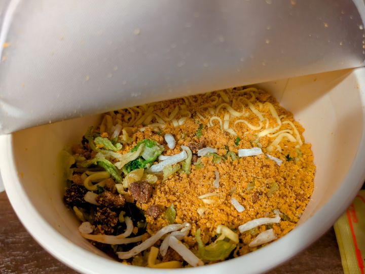 お湯を注いで、フタの上で特製辛味油を温めながら5分待ちます。