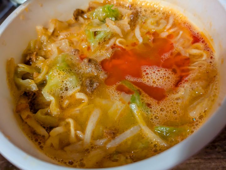 蒙古タンメン中本カップ麺を“辛さ5”とするなら“3”くらいの印象で、パッケージ表記どおりの辛さです。