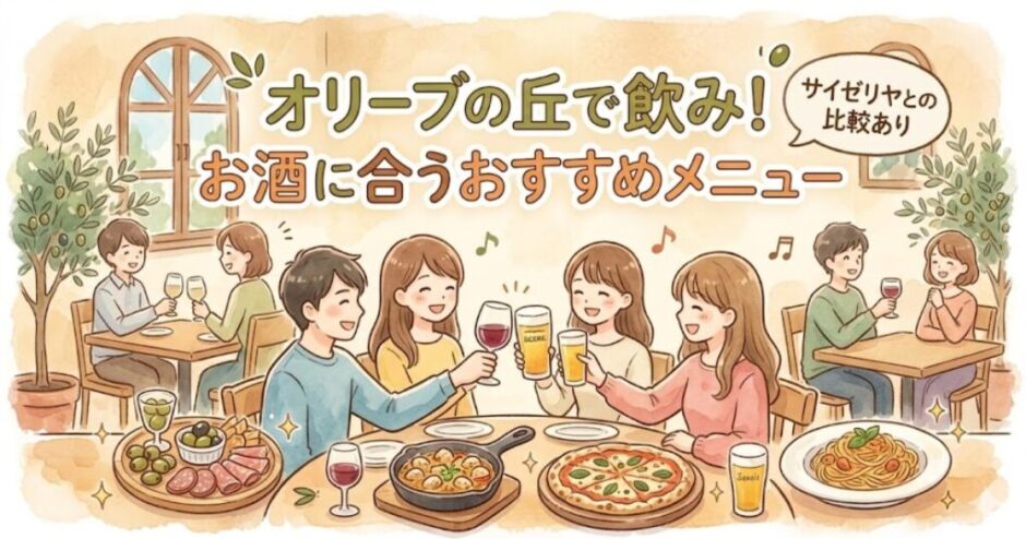 今回は、サイゼリヤの上位互換とも噂されるオリーブの丘で、ガッツリお酒を楽しんできました!